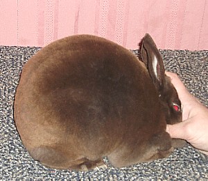 Sired by Hop Chocolate Miss You and out of a Broken Chocolate doe from SS Rabbitry of York. Sanyo has nice type and fur, but sits at the top of the weight class, so she is a brood doe in my herd.