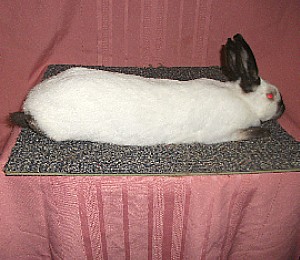 Nice doe bought for her awesome coat! In this picture, she is still nursing a litter, so she is a mess, but it shows her nice type! Some of her kits are listed on the Junior page and the Sale page!